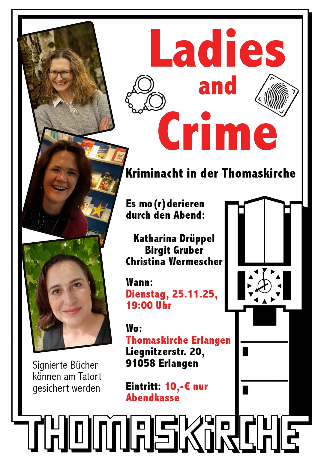 20. November 2025 Ladys and Crime - Thomaskirche Erlangen An einem ganz außergewöhnlichen "Tatort" lasen wir Krimiautorinnen Katharina Drüppel, Christina Wermescher und ich diesmal aus unseren Krimis. Herzlichen Dank an die Organisatoren der Thomaskirche in Erlangen und das tolle Publikum! tagPlaceholderTags: allgemein Kommentar schreiben Kommentare: 0